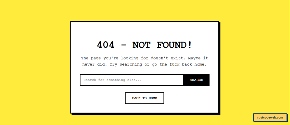This custom 404 error page provides a better user experience when someone lands on a missing or broken link. It features a clear message, a search form, and a "Back to Home" button. The design is bold and responsive, making it suitable for modern websites.